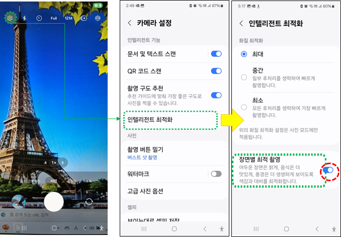 카메라설정의 앞부분에 있는, "인텔리전트 최적화"를 선택하고 맨우측의 그림과 같이 “장면별 최적촬영”을 찾아서 바로 옆에 있는 온 오프 스위치를 켜시면 카메라 화면 중앙에 하얀색 원과 안내선이 나타납니다. 이때 카메라를 움직이면 또 하나의 노란색원이 나타나는데 피사체를 따라 이동하다가 구도가 잘 맞춰지면 하얀원속에 노란색원이 합쳐지고 이때가 바로 인공지능이 추천하는 구도가 되는 것입니다. 바야흐로 셔터만 누르면 인공지능이 추천한 구도로 사진이 만들어지는 좋은 세상입니다.