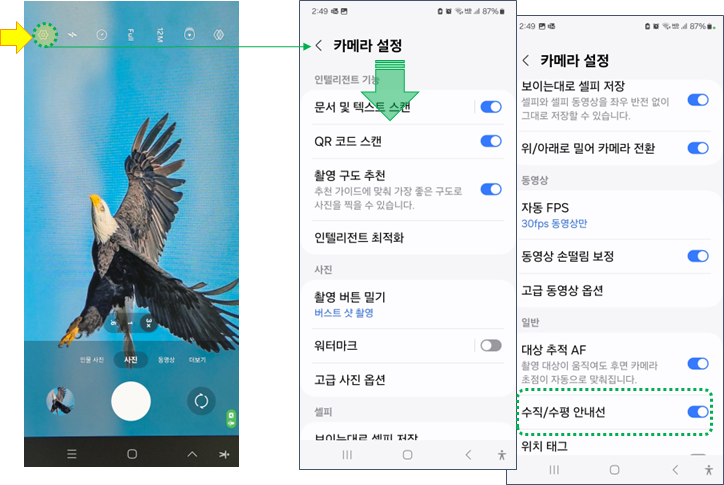 카메라 앱을 작동시키시고 좌측상단 설정(톱니바퀴모양)을 선택합니다. 설정화면에서 계속 아래로 이동하시고 ( 한페이지가 넘어갈때쯤 나타나는 )“수평/수직 안내선”을 찾아서 옆에 있는 온 오프 스위치를 켜시면 카메라 화면안에 상하좌우 두줄씩 네 개의 안내선이 나타나게 되어 사진촬영과 프레이밍(framing)에 도움을 받을 수 있습니다.