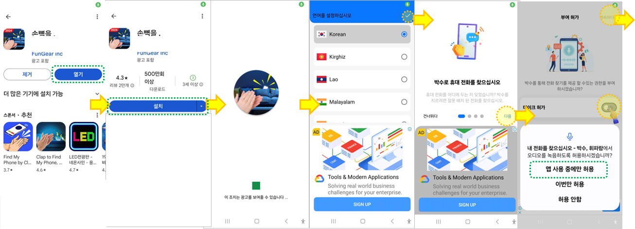 설치를 선택하시고 열기를 누릅니다 박수그림이 보여지고 언어를 설정하란 메시지가 보이면 Korean(한국어)을 선택합니다 “박수로 휴대 전화를 찾으십시오”가 보이면 일정거리를 두고 박수를 쳤을때 스마트폰이 경광활동(경보소리와 점멸신호)을 해서 스마트폰의 위치를 알 수 있게 합니다. (음성암호를 사용할수도 있고, 노터치기능도 있습니다만, 생각보다 요란한 소리와 후래쉬기능에 주의 하세요) 편리한 방법이지만 설치과정에 광고가 너무 많고 엉뚱한 앱들이 까메오로 수시 등장하는 탓에 좀 혼란스럽고 불편합니다. 그렇지만 앱이 편리하시다면 사용하는것도 한가지 방법입니다.