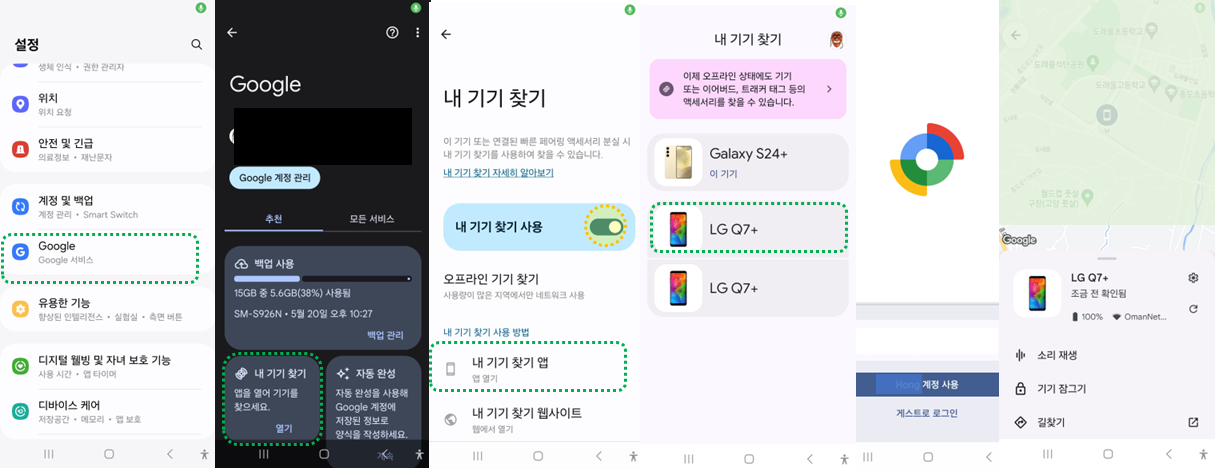 설정화면에서 Google을 선택하시면 내 구글계정의 정보가 나타납니다. 내 구글계정의 정보를 관리할수 있는 화면이지만 지금은 스마트폰을 찾기 위해서 우측하단에 있는 내기기 찾기를 탭(누름)합니다. 내기기 찾기 화면이 나타나면 내기기 찾기 사용 옆에 있는 On/Off스윗치를 켬으로서 서비스를 이용할수 있게 됩니다. 그 다음에는 지도위에 표시된 내기기의 위치를 볼수있는 앱(App) 이나 웹(Web)을 선택합니다. 저는 App열기를 선택했는데 제가 등록된 안드로이드 스마트기기가 모두 나타나서. LG Q7+를 선택했더니 일회성 조회와 구글계정조회를 확인한후 화면과 같은 지도와 위치정보를 얻을수 있었습니다. 집안에서 스마트폰을 찾는 경우라면 지도 아래부분에 소리재생을 선택해서 벨소리를 울릴수도 있습니다. 찾을때 훨씬 도움이 되겠지요. 집밖에서 분실한 경우라면 기기 잠그기로 보안을 유지할수도 있습니다.
