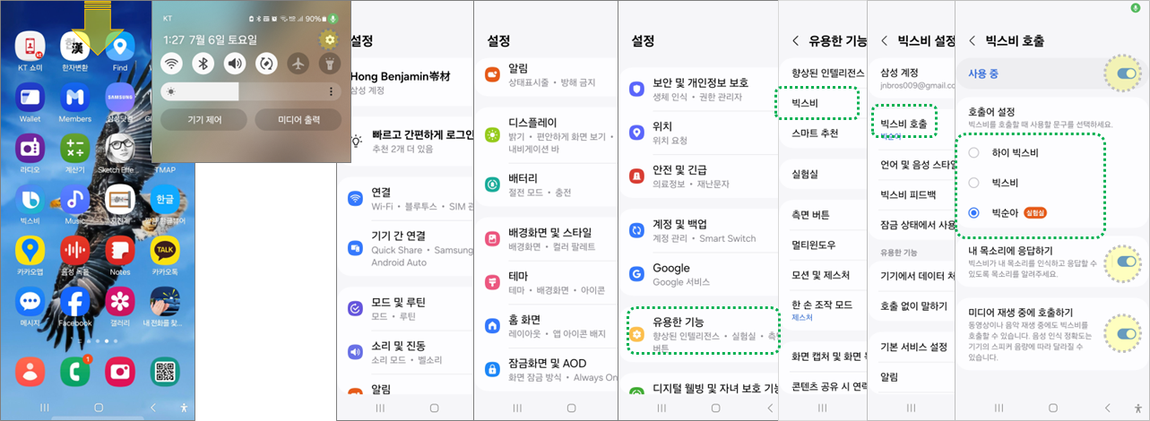 그렇게 하려면 먼저 빅스비를 활성화시키기 위해 화면을 쓸어내린후 우측상단의 설정(톱니바퀴 모양)을 선택합니다. 그리고 설정화면에서 아래로, 아래로 이동하셔서 유용한 기능 항목을 찾아서 선택해 주세요. 화면이 바뀌면 윗쪽에 보이는 빅스비를 선택하시고 다시 바뀐 화면에서 빅스비 호출이란 항목을 찾아서 선택합니다